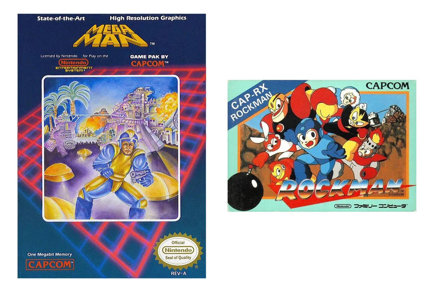 American "Megaman" and Japanese "Rockman" box art